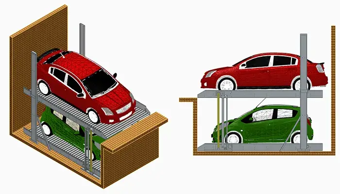 This parking solution features an independent two-level configuration, offering space for two vehicles—one on the lower platform (within a pit) and the other on the upper platform. When retrieving the upper vehicle, the system lowers both platforms simultaneously, placing the lower car into the pit while bringing the upper car down to ground level for easy access.To access the lower vehicle, the system lifts both platforms together, raising the lower car to ground level for removal.