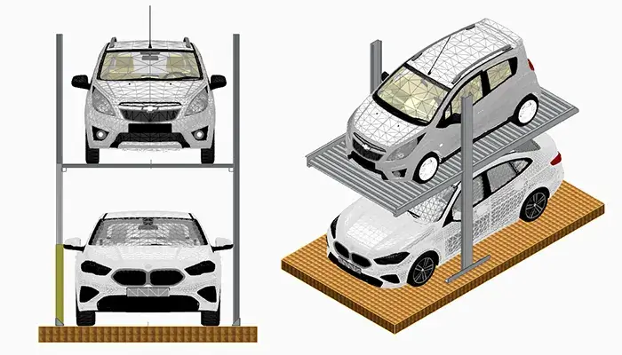 This is a two-level dependent stack parking system designed to accommodate two vehicles— one parked at ground level and the other on an elevated platform above it. To access the upper- level vehicle, the lower car must be moved out first. This system is versatile and can be set up both indoors and outdoors.